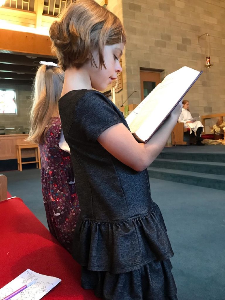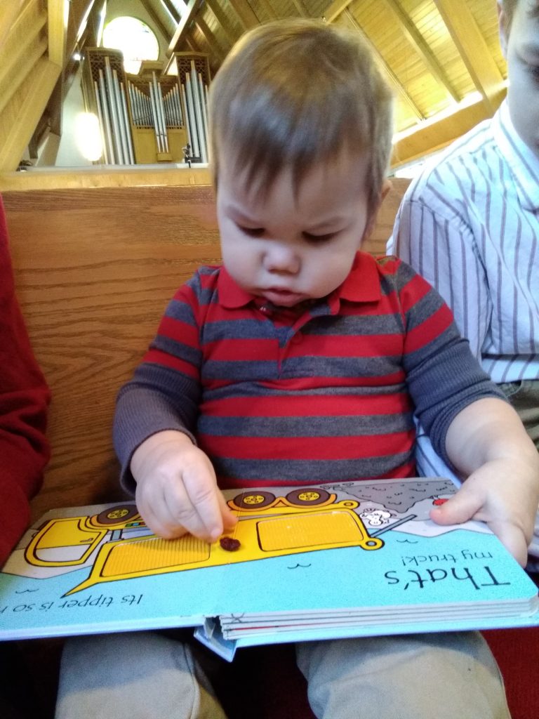 Many parents reason that their children don’t understand what’s going on in church, so they wait until they’re older before attending church service or put them in the nursery. On the contrary, children can absorb much more than we know and they have an amazing ability to memorize. When children are in church service every Sunday, they hear many of the same prayers and songs throughout the service. Over time, they will start singing and praying along with the congregation. My children have memorized The Lord’s Prayer and our church’s liturgy (the order of worship) by 3-4 years of age. They will randomly hum church hymns throughout the day, surprising me with how much they remember. Children can memorize and retain the flow of worship, which only helps later when they learn to read and can follow along.